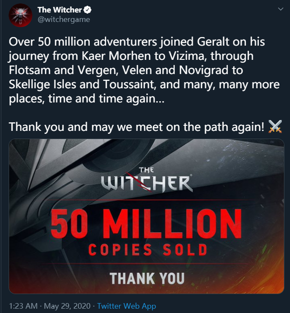 “超过5000万的冒险家已经接连不断地加入到杰洛特从凯尔莫罕到维吉玛,穿过浮港和弗坚、威伦和诺维格瑞到史凯利格群岛和陶森特,还有许许多多地方的旅行……感谢您,期待我们在旅途中再次相遇!”——《巫师》官方Twitter