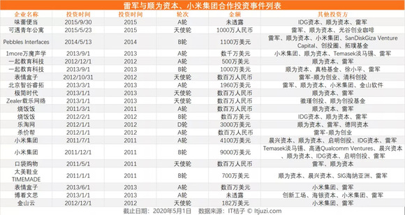 2011 年以前,雷军通常以天使投资人的身份出现在交易中,投资的逻辑围绕「熟人」而来,同时雷军也往往与「熟人」合作投资。2010 年小米成立,2011 年「顺为」应运而生,此后,雷军的个人投资通常与顺为资本和小米集团合作,单独作为天使投资人参与的项目相对较少。
