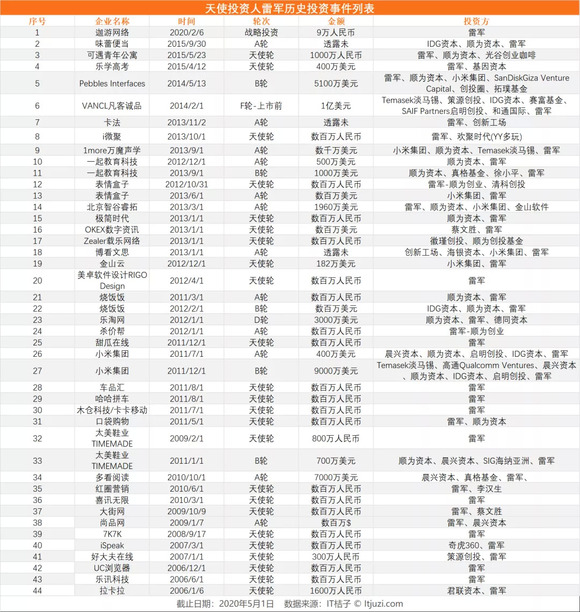 雷军在一次公开演讲中自称投资生涯从 2007 年开始,实际上 IT 桔子数据显示,在 2006 年雷军就参与投资了拉卡拉、UC 浏览器等企业,至今雷军的投资生涯接近 15 年。
