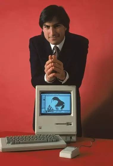 1984年,乔布斯倚靠在最初的Macintosh 128K个人电脑上。