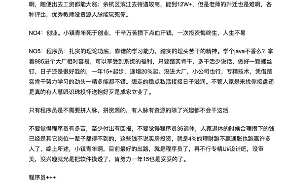 “985贴吧”将计算机专业称为“宇宙机”,与之对应的还有推荐考公务员的“宇宙公”、鼓励学师范的“宇宙师”和推荐学医的“宇宙医”,而其他一些专业诸如化学、生物、地质则被划归为“天坑”专业,不如“宇宙机”可以更好地帮助毕业生在城市立足。在“985废物小组”一篇名为《小镇做题家的最好出路》的帖子中,楼主分析认为,程序员的工作要胜过金融(需要人脉)、教师(升迁难)、公务员(需要社交能力)和创业(有血本无归的风险),因为“只有程序员需要靠谱的学习能力,是不需要拼人脉和资源的”,又可以获得相对丰厚的报酬,因此恰恰符合了组员的特征与需求。