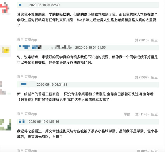 “富裕、负责、消息灵通、支持有力”便是对符合这一体系的成功父母提出的具体要求。在“985废物引进计划小组”中,我们可以从“小镇做题家”们的自白与回溯里看到对父母能力有限的认识。有的组员认为家长“支持”不够、全依靠自己选择,以及小地方环境带来的“眼界”不够开阔。这种“支持”与“眼界”的差距,对高中时期的“小镇做题家”们或许并不重要,但在抵达城市、进入大学之后,情况就发生了变化。