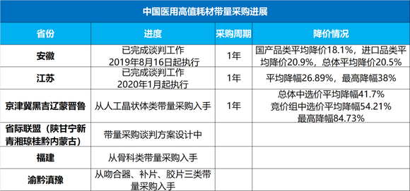 自去年安徽、江苏两省率先执行高值耗材带量采购,到近期“3+N”联盟人工晶状体类高值耗材联合带量采购,再到带量采购方案正在设计中的陕甘宁闽渝黔等十余个省市,高值耗材带量采购已成趋势。