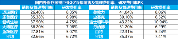 另一方面,从国产高值耗材生产商的销售及管理费用率、研发费用率水平来看,与海外医疗器械企业并无明显差距,并未普遍出现国内医药企业“重销售,轻研发”现象。(欲了解国内药企销售费用详情,请戳信披直通车历史文章《恒瑞医药“行贿门”背后:我国创新药企销售费用为何居高不下?》)然而,国产高值耗材企业在原材料、关键技术的缺失,使得进口高值耗材具有一定稀缺性,存在定价优势,并占据国内市场主要市场份额。