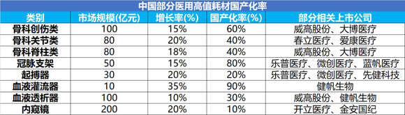 根据公开资料整理,目前,在国内骨科、心血管、血液净化及影像诊断等领域中,骨科关节、脊柱类、起搏器、血液透析器及内窥镜等产品国产化率不超过40%,仍存较大国产化替代预期。