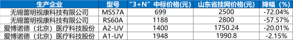 在带来市占率提升、国产化替代机遇的同时,带量采购同样给国内高值耗材企业带来了不输于进口品牌的降价压力。通过对比“3+N”联盟带量采购中标结果与山东省披露的挂网价格发现,同一型号的国产人工晶状体价格降幅也可达20%~70%。