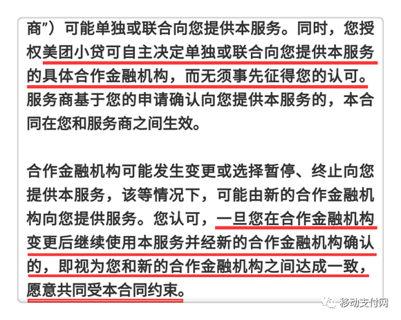 合作金融机构是谁?《合同》里面这样回答:美团小贷可自主决定合作的金融机构,无须征得您的认可。