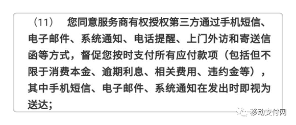 个人信息除了会共享给服务商之外,有可能还会共享给第三方催收公司。《合同》明文写到:用户须同意服务商授权第三方通过电话、短信、电子邮件等多种方式督促用户还款。