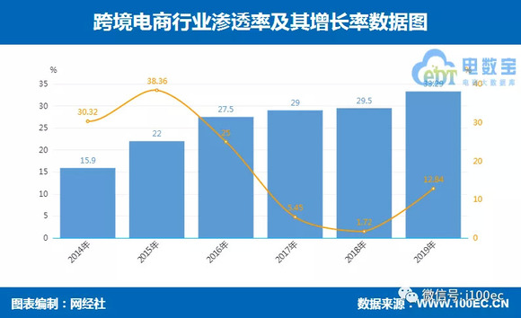 据网经社“电数宝”电商大数据库监测数据显示,2019年中国跨境电商行业渗透率33.29%,相比2018年29.5%,提升3.79%。
