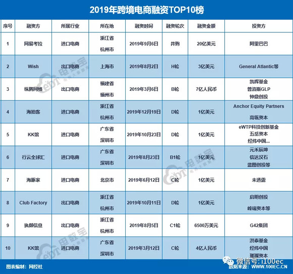 融资前十事件包括:网易考拉(获20亿美元被并购)、Wish(获3亿美元H轮)、纵腾网络(获7亿人民币B轮)、海拍客(获1亿美元D轮)、KK馆(获1亿美元D轮)、行云全球汇(获1亿美元B1轮)、海豚家(获1亿美元C轮)、Club Factory (获1亿美元D轮)、执御信息(获6500万美元C1轮)、KK馆(获4亿人民币C轮)。