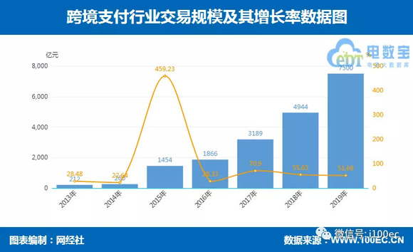 据网经社“电数宝”电商大数据库监测数据显示,2019年中国跨境支付行业交易规模达7500亿元,同比增长51.69%。