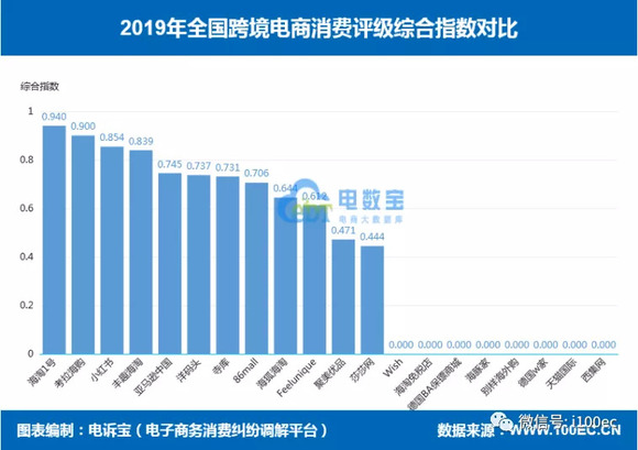 报告显示,据国内唯一电商专业消费调解平台“电诉宝”用户维权案例库显示,《2019年全国电子商务TOP190消费评级榜》中,跨境电商共20家电商平台入选,包括:海淘1号、考拉海购、小红书、丰趣海淘、亚马逊中国、洋码头、寺库86mall、海狐海淘、Feelunique聚美优品、莎莎网、Wish、海淘免税店、别样海外购、德国w家、天猫国际、西集网、海豚家、德国BA保镖商城。
