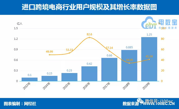 据网经社“电数宝”电商大数据库监测数据显示,2019年中国进口跨境电商用户规模1.25亿人,同比2018年的8850万人增长41.24%。