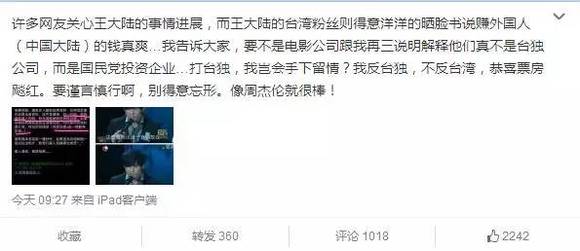 但有人看不下去了,称王大陆从没发表过任何政治观点,也没参加过什么政治活动,一条脸书的宣传语能证明他是台独分子吗?有人认为,黄安把“反台独”渗透到观众的观影日常,这事儿办的不漂亮。