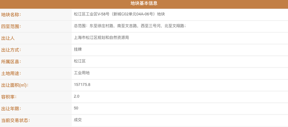 经选址960查询,腾讯拍下的地块应为「松江区工业区V-58号(新城C02单元04A-06号)地块」,该地块为工业用地,使用年限50年,面积15.72万平方米,成交价格2.37亿元,竞得人为上海珑睿信息科技有限公司。