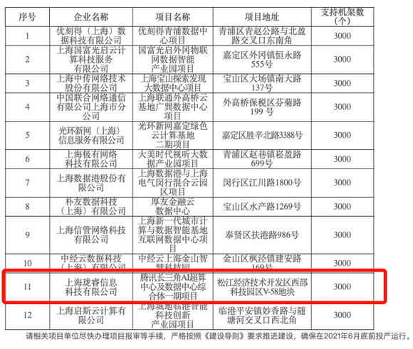 而前文名单也则显示,除了腾讯超算中心项目,上海还有其它11个机架数达3000个规模的新建互联网数据中心项目将投产。