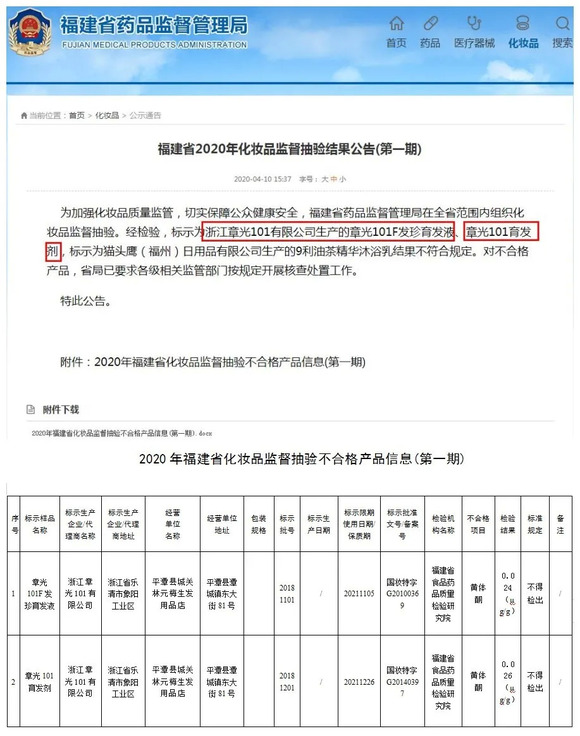 根据福建药监局发布的福建省2020年化妆品监督抽验结果公告(第一期)(下称公告)及相关附件信息显示,标示生产企业为浙江章光101有限公司生产(下称浙江章光101)的两款产品,章光101F发珍育发液(标示批号为20181101)和章光101育发剂(标示批号为20181201)均被检出含有违禁成分黄体酮,且这两款产品被检测出的黄体酮含量分别为0.024μg/g和0.026μg/g,因此被福建药监局列为不合格产品。