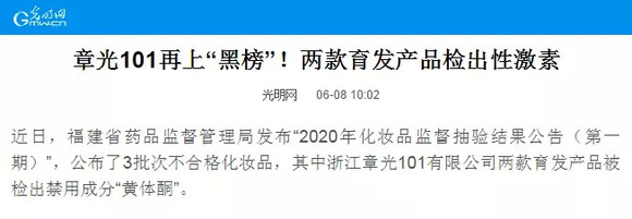 近日,光明网报道称,浙江章光101有限公司旗下两款章光101的育发产品因被检出禁用成分黄体酮,被福建省药监局通报。