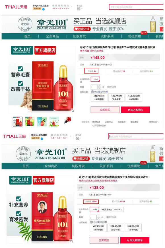 青眼发现,目前上述两款涉案产品在章光101天猫旗舰店上仍为正常销售状态,其中章光101F发珍育发液的单价为148元(120ML装),章光101育发剂的单价138元(120ML装),并且两款产品的销售并不高,月销量分别为24件和1206件。