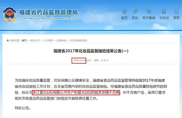 2018年1月4日,福建药监局发布公告称,经福建省食品药品质量检验研究院检验,标示为浙江章光101有限公司生产的章光101防脱洗发精不合格,原因是产品被检出菌落总数高达22000CFU/g,较规定的1000CFU/g超标了22倍。