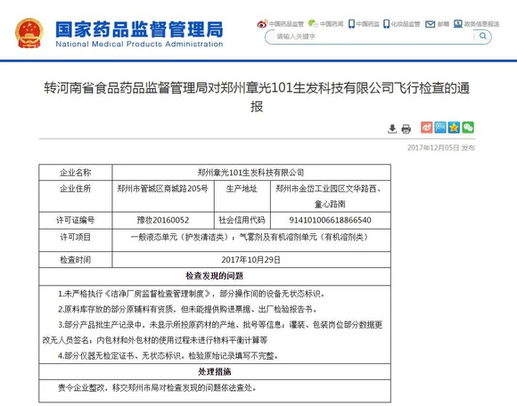 根据国家药监局2017年12月5日发布的信息显示,河南省食品药品监督管理局对郑州章光101生发科技有限公司进行飞行检查中,被查出部分仪器无检定证书、无状态标识等问题,后者被责令整改依法查处。