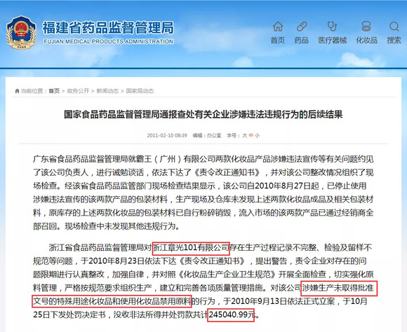 2011年2月10日,在福建药监局发布的《国家食品药品监督管理局通报查处有关企业涉嫌违法违规行为的后续结果》中显示,浙江章光101有限公司因存在生产过程记录不完整、检验及留样不规范等问题,被浙江省药监局于2010年8月23日下达《责令改正通知书》,并提出警告,责令整改;并且,该公司还因涉嫌生产未取得批准文号的特殊用途化妆品和使用化妆品禁用原料的行为,被依法立案,于2010年10月25日被处以没收非法所得并处罚款共计245040.99元。