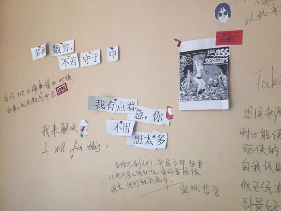 在康阳乱七八糟的办公室,可以看到“奥巴马同款”的星战玩具、各种看上去像致幻剂的瓶瓶罐罐 ,还有加藤鹰的“自慰手”随意摆在书架上。进门右手边的墙上,用签字笔写着密密麻麻的段子,读起来有点意识流。