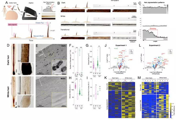 而美国哥伦比亚大学医学中心研究人员的研究人员对14个志愿者的397个头发样本进行成像和数字化分析,其包含纯深色,纯白色及由黑变白的三种色素沉着模式。他们对同一来源的深色和白色的HS进行了全面的蛋白质组分析,从中提取定量到323种蛋白质,经过分析发现,与深色头发相比,白发中有67个蛋白上调,主要参与蛋白质合成和氨基酸代谢、抗氧化酶、葡萄糖及脂质代谢过程等;有23个蛋白下调,主要涉及与黑素体生成、分泌及跨膜转运相关的溶酶体蛋白和主要角蛋白等。
