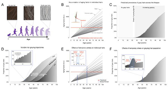 研究人员还为此开发了HPPs模拟计算机模型,模拟了急性应激源的影响,发现头发暂时性变白不会影响到所有头发,只有那些在压力暴露时接近阈值的头发才会变白,而累积衰老因子而但低于压力阈值的头发不会显示出压力引起的变白。