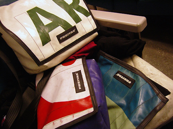 也许你已经猜到,这个品牌正是和Daniel Freitag同名的瑞士包袋品牌FREITAG。1993年,Daniel Freitag与哥哥Markus Freitag从高速公路中飞驰的卡车上获得灵感,他们联系到卡车公司,回收用来包裹车厢的厚重篷布,把这种防水耐磨的材料制作成一个个邮差包。