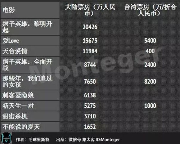 再说《爱》与天台爱情。《爱》由华谊兄弟投资,钮承泽指导,本身就是一部大陆电影,只是在故事和情节设计上加入了台北的故事,再加上当红明星拼盘和情人节档期,十分讨巧。在台湾也完成了破亿台币的成绩。而《天台爱情》就可以归结于周杰伦在内地强力的粉丝号召力。但该片在台湾的成绩却足以让周杰伦如鲠在喉,2000万新台币,不及大陆票房零头。