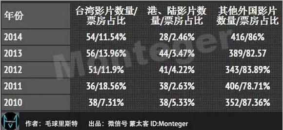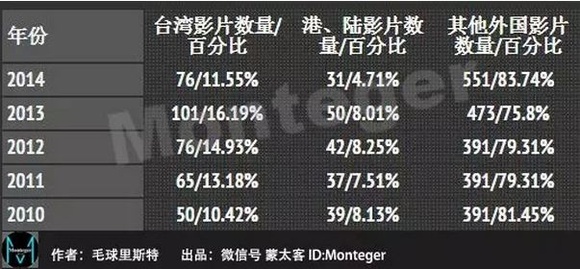 从台湾角度来说,为了保护本土电影的发展,台湾对大陆电影一直是有配额限制的。七个电影题材类别为限,每年只有10部大陆电影可以登上台湾银幕。2013年之前,这10个名额是靠先到先得,2013年之后,这10个名额就靠抽签派发发行和放映许可。这样做其实无可厚非,对于本土电影的保护从法国到韩国,各个国家也都有据可循,且某种程度上来说是非常必要的。台湾电影的产量曾经萎缩到年产10余部,近几年的保护和扶持政策才让数量逐渐上升。但问题是,台湾从加入WTO之后就对好莱坞等外片没有限制,每年发放准演证的占比具体看下表。外国影片的占比高达83%,远远高于港陆台三地的影片。某种程度上来说,也助长了好莱坞电影侵蚀台湾市场的现状。