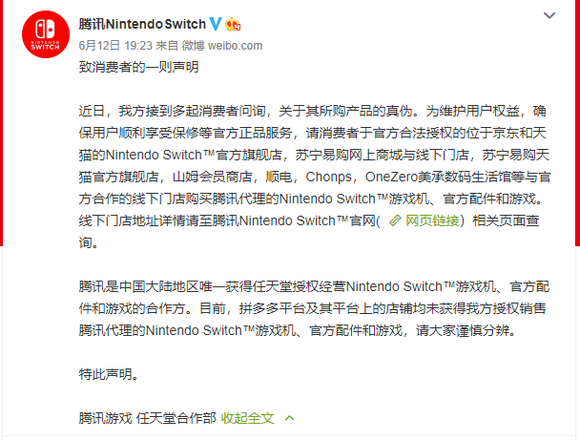 6月12日晚,腾讯 Nintendo Switch 在官方微博和公众号发布致消费者的一则声明,指出目前拼多多平台及其平台上店铺均未获得授权销售腾讯代理的 Nintendo Switch 游戏机、官方配件和游戏,请大家谨慎分辨。