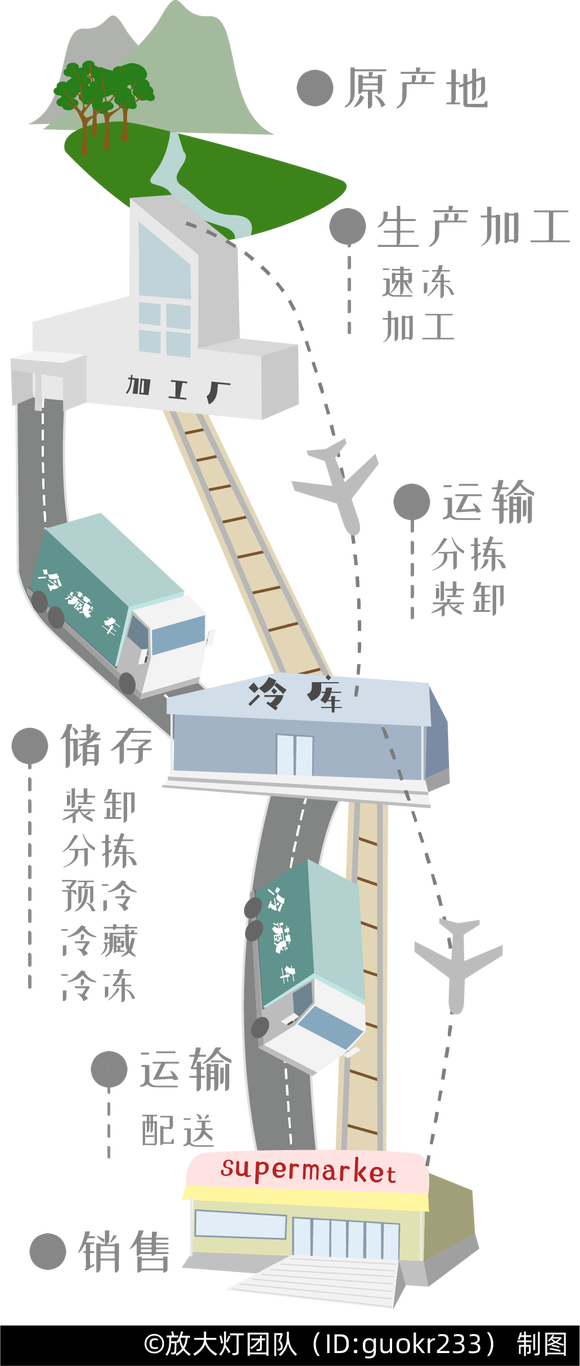 冷冻肉、冰淇淋、冰鲜水产、酸奶、冷冻果蔬等食物就是典型的冷链物品。在被消费者带回家之前,它们需要经历这些: