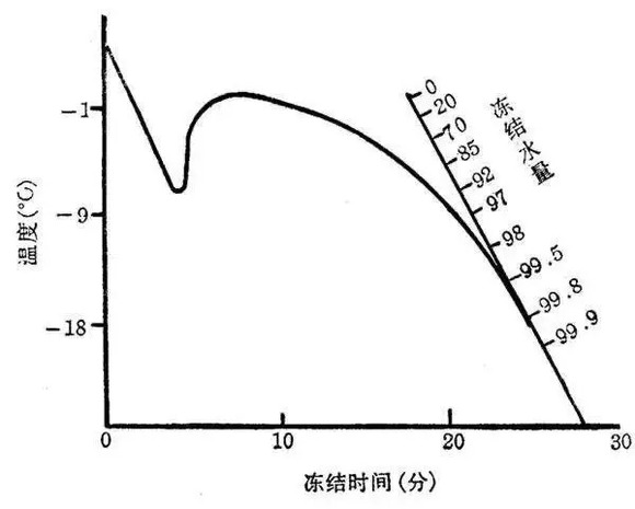 不同食物冰点不同,只有温度足够低时,食物中的大部分水才能冻结。当牛肉薄片的温度为―4℃时,只有70%的水分被冻结;温度下降到零下9℃左右时,也还有3%的水分未冻结;即使牛肉薄片的温度降低到零下18℃时,也不是100%的水分都被冻结住。