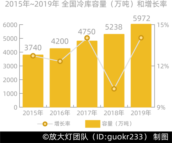 全国冷库容量及增长速度 | 资料来源:中物联冷链委研究院 [13]