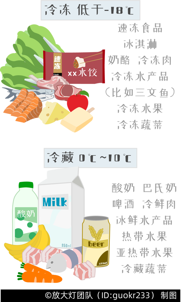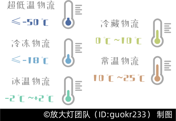 和你家冰箱分冷冻室冷藏室类似,冷链也有不同的温度。《GB/T 28577 冷链物流分类与基本要求》[4]按不同温度区段将冷链物流分为了超低温物流、冷冻物流、冷藏物流等。