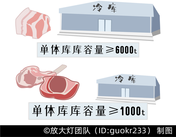 这些储备肉会分散在符合条件的承储企业冷库中,商务部曾在2018年7月和2019年1月按《中央储备肉冻肉储存冷库资质条件》分别建立了中央储备冻猪、牛羊肉承储企业的备选名录库。《资质条件》对承储冷库提出了规模要求: