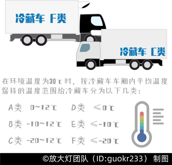 为区隔冷藏车运输货物的控温类型,《GB 29753-2013 道路运输食品与生物制品冷藏车安全要求及试验方法》将运送食品的冷藏车按控温范围分类A~F六类。