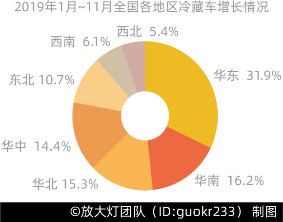 和冷库的地域分布类似,冷藏车的区域增长也呈现出东多西少的特点,其中华东地区增长量最高。你需要生鲜电商和便利店,而这些商家需要冷藏车。