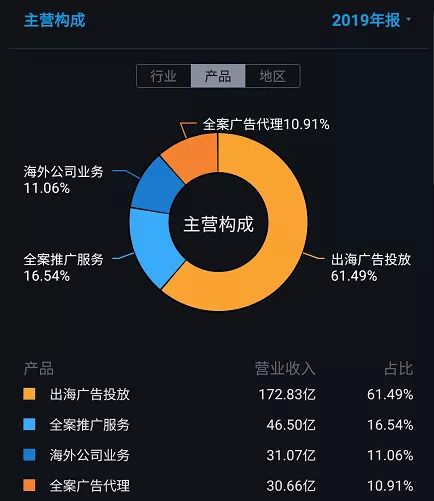 在这张2019年报图表中更是能清晰的看到,作为公司业务构成的大头,出海广告投放说的正是抖音以及字节跳动。