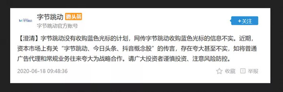 不光直接否认收购蓝标的消息,顺便还diss了一大批蹭热点的上市公司。字里行间能明显看出,字节跳动对这种绑架自己炒作他人的情况已经忍到了极限了。