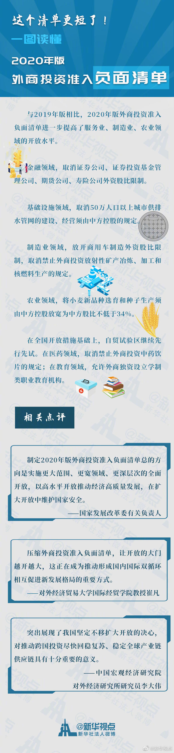 国家发展改革委有关负责人说,发布2020年版外商投资准入负面清单,是实施更大范围、更宽领域、更深层次全面开放的重要举措,也是外商投资法施行后,推进负面清单管理制度的最新配套文件,展示了我国坚定不移支持经济全球化和跨国投资的决心。我国要以更高水平开放促进经济高质量发展,在扩大开放中维护国家安全。