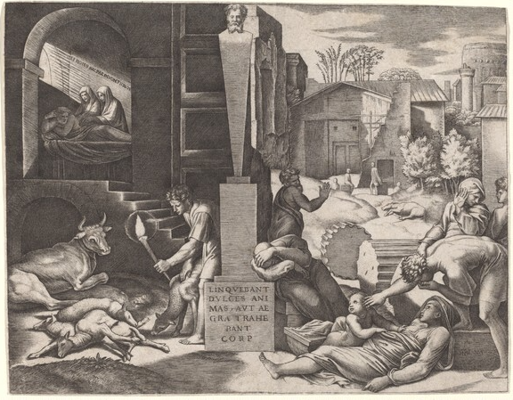 “画圣”拉斐尔曾创作过一幅《瘟疫》,用来表达他对这场肆虐的疾病的感受。不过,这件作品已经不存,我们现在只能看到艺术家马可安东尼奥·雷蒙迪的仿作。作品取材于维吉尔史诗《埃涅阿斯纪》,该诗讲述了英雄埃涅阿斯在特洛伊战争后逃往意大利的故事。在诗的第三卷,特洛伊人建造了一座城市,但却遭受了一场可怕的瘟疫,人和动物皆在一年内死亡。画面即表现了瘟疫来袭的时刻:画面左边远景表现了躺在病床上的垂死之人,近景的两边则分别是生病的牛羊和因疾病饱受折磨的人类。其中,一个幼儿并不知道自己的母亲已经死去,他守在母亲的身旁不愿离开。