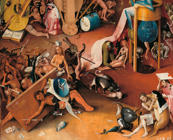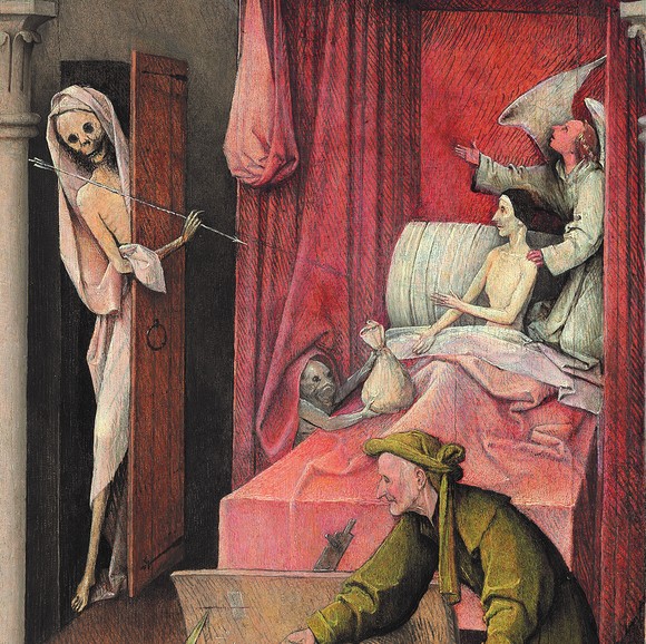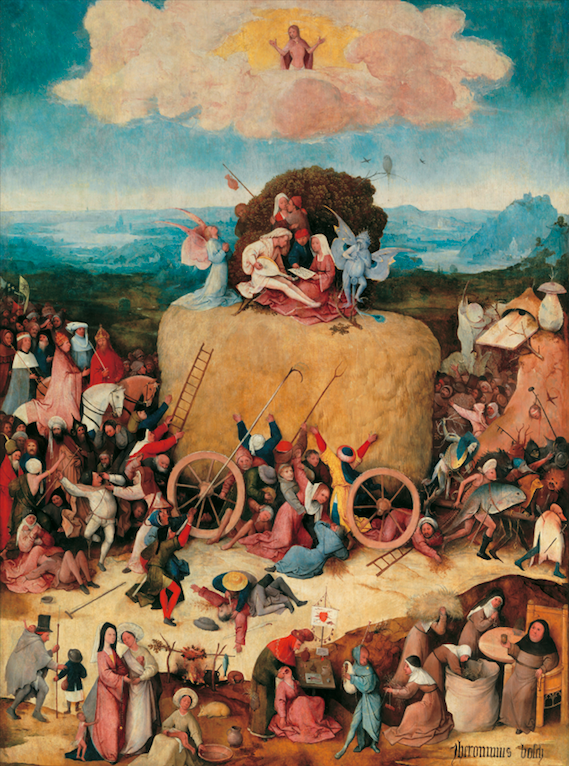 在整个欧洲范围内肆虐的黑死病,影响当然远不止在意大利。希罗尼穆斯·博斯是北欧艺术家中对黑死病较早做出反应的人。在疾病造成的各种连锁灾难中,他识破了天主教会的伪善,也描画了最真实的人性。他常常在画作中描绘人类的各种缺点,并以宗教故事和寓言的形式表现出来。在《干草车》三联画中,人们哄抢着上帝慷慨赐予的干草,为此不惜争夺、杀戮和欺骗;在《快乐之园》的“音乐地狱”中,赌博、谎言、贪吃和懒惰等人性缺点被尽数表现,失去信仰的人们遭受着无尽的惩罚。