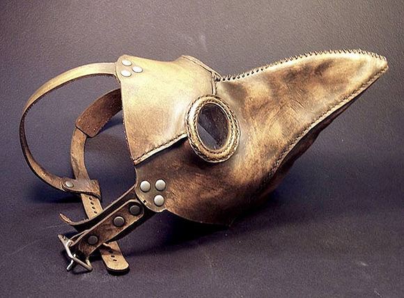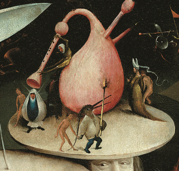 博斯的画中还经常出现鸟头人身的形象。除了具有一定的寓言性,这似乎受到了当时流行的防护装备的影响。在中世纪和文艺复兴早期,为了防止黑死病和麻风病等疾病的传播,有条件的人们也会采取一定的防护措施,戴鸟喙状的口罩就是其中的一种。长长的鸟嘴里存放着草药和香料,草药被认为可以阻止病毒的传播,而香料则能够掩盖死尸的气味。