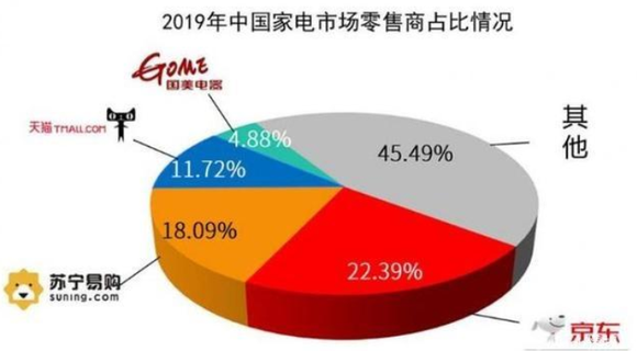 同时,国美电器的体量也已经远不如“后浪”,真的比较起来,还显得有些落魄。据《2019年中国家电市场报告》显示,国美电器的市场份额仅4.88%。