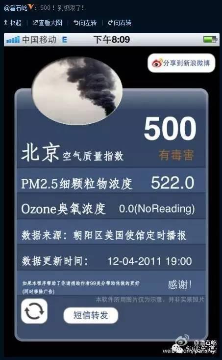 霾之后,是“ PM2.5 ”,又一个词语被“科普”。伴随着微博的兴起、舆论传播速度指数级增长,2011 年美国大使馆开始实时播报 PM2.5 指数,中国政府从一开始指责美国人干涉内容,到后来辩解 PM2.5 不重要,PM10 才关键;然后沉默;最后才承认 PM2.5 对环境影响很大。