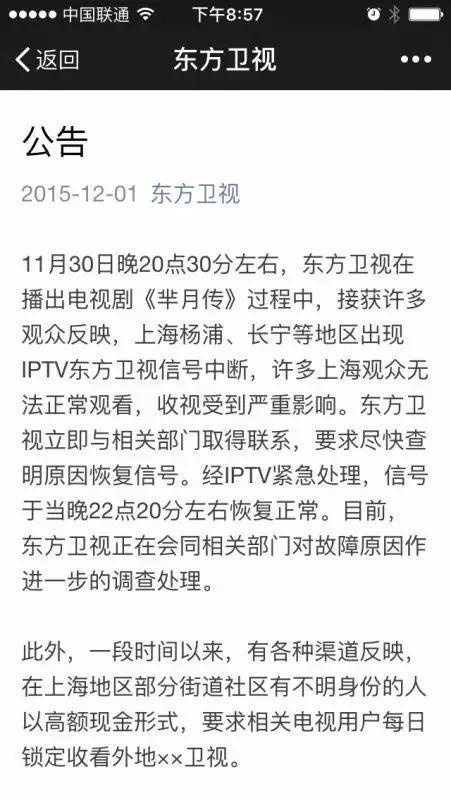 不过,东方卫视认为这两天的收视情况并不真实,在他们连续两天的公告中,东方卫视表示,“上海某些地区以及外省市的IPTV东方卫视的信号被多次中断”。