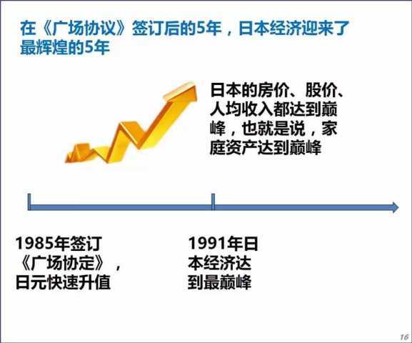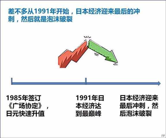 《广场协议》成了日元国际化进程中的一个里程碑,日本经济由此迎来了巅峰。但随后,日本政府开始主动采取财政紧缩政策预防经济过热,日本经济迅速崩溃,从此一蹶不振。